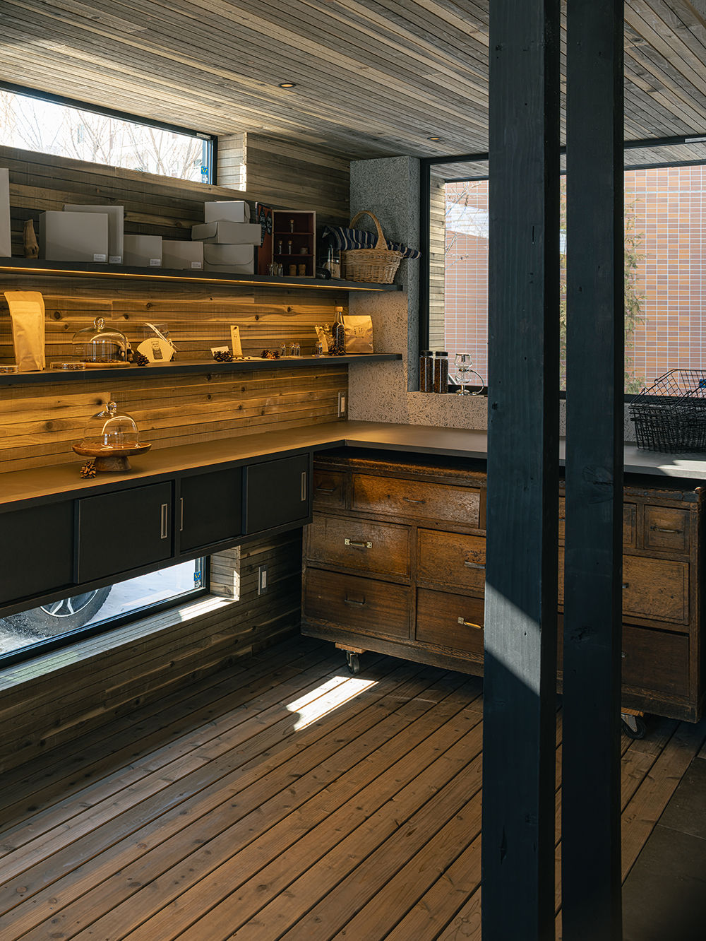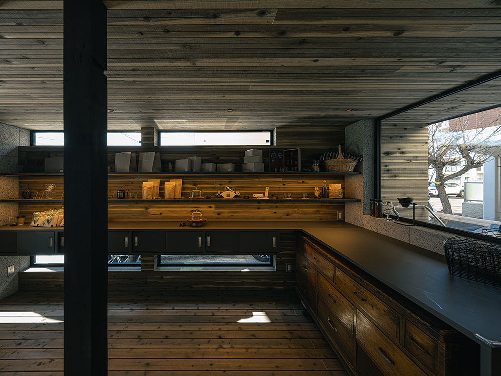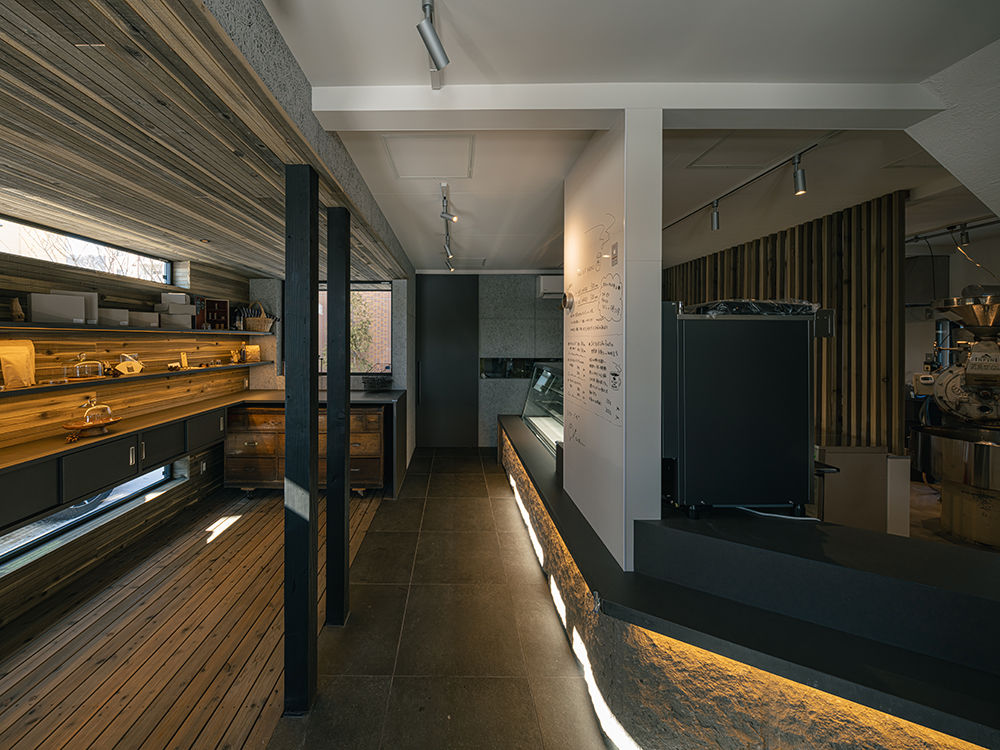 また、前オーナーから受け継いだ焙煎所は道南スギの縦格子で仕切り、新たに設けた菓子製造スペースの木毛板仕上げとも自然になじむよう配慮しました。