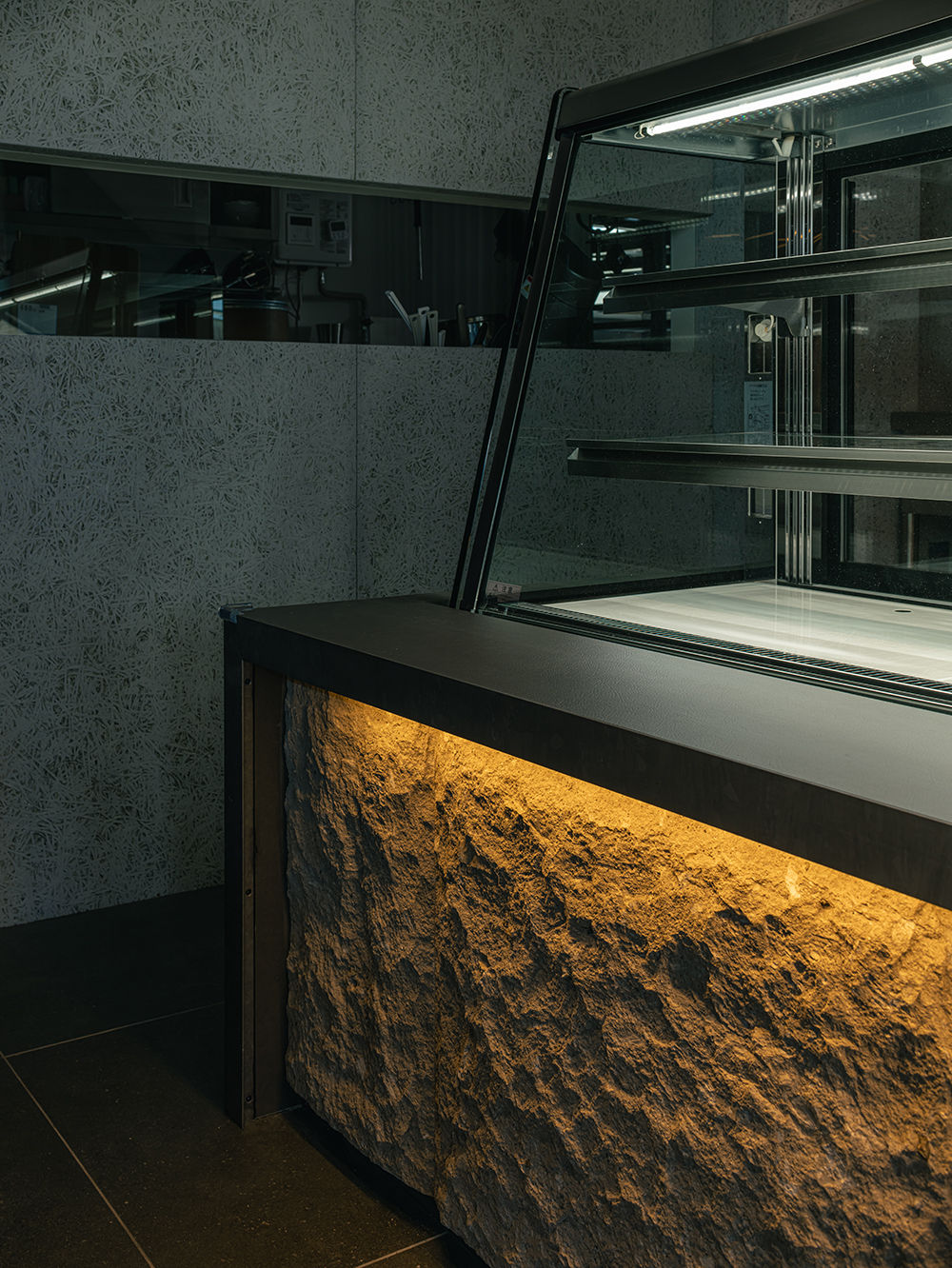 洋菓子が並ぶショーケースとレジカウンターには、外観と素材を揃えたリン酸処理のスチールプレートを採用し、内と外に一体感が生まれるようデザインしました。