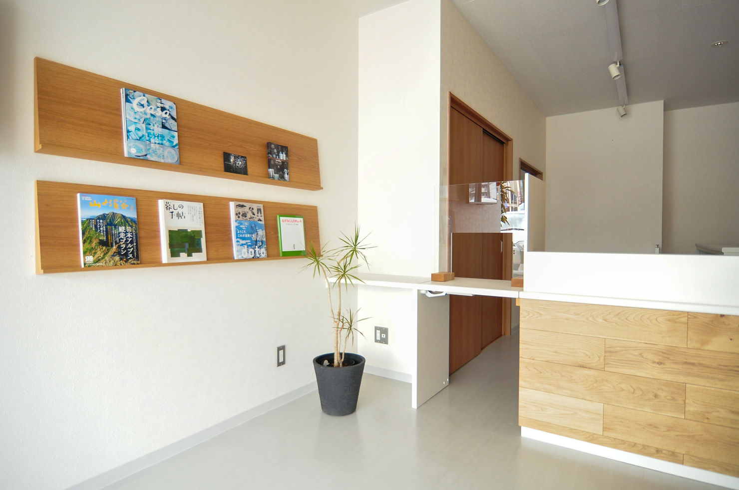 木目の温もりに加え、大鉢の植物も取り入れ、自然を表現。