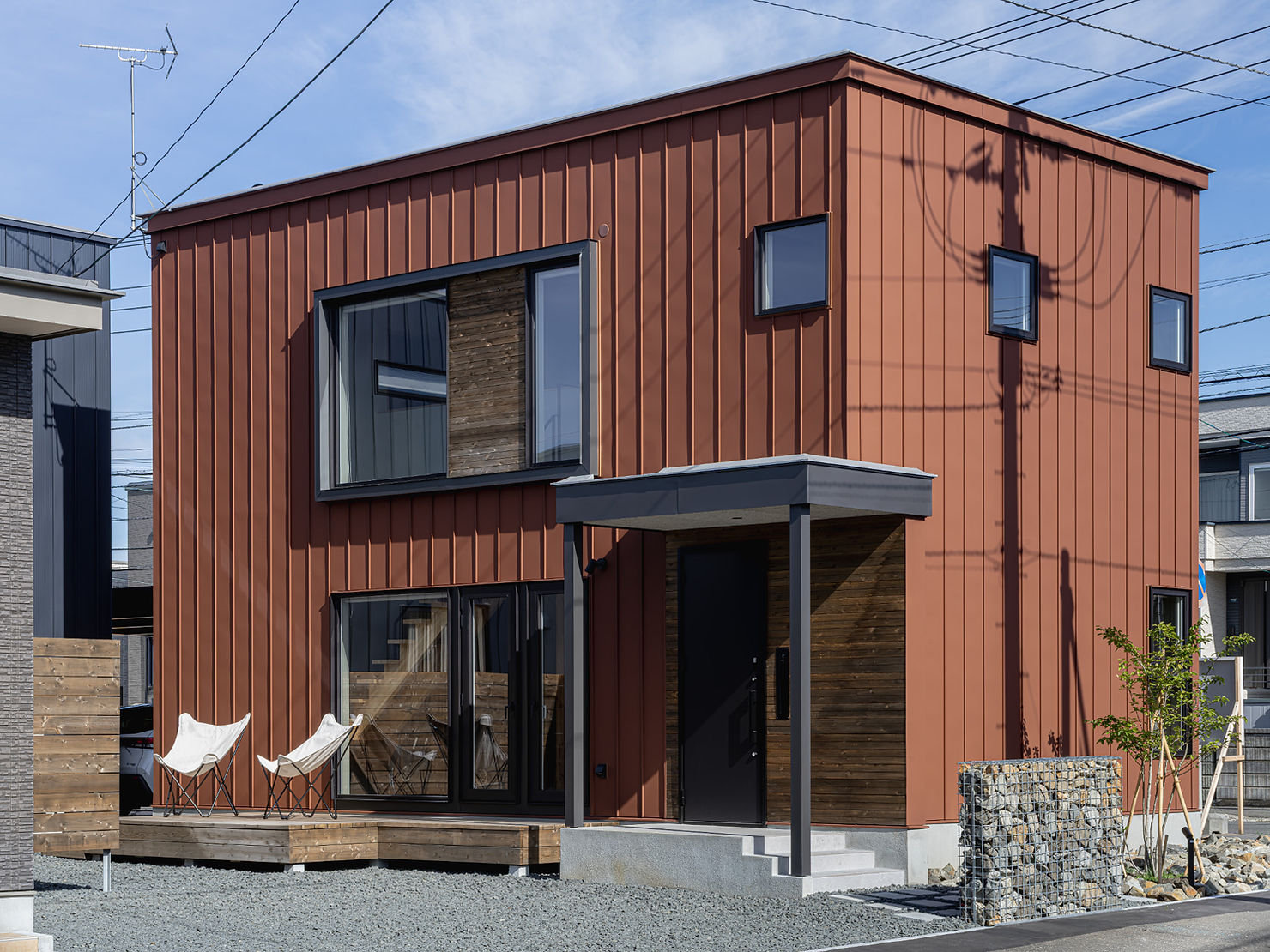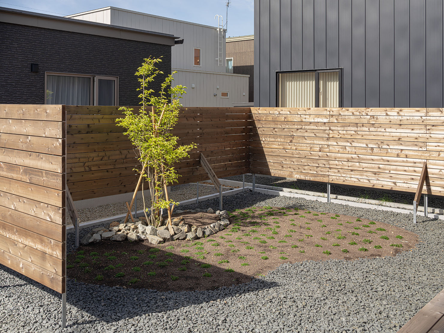 ウッドフェンス・ウッドデッキともに、外壁のガルバリウム鋼板と相性のよい道南スギを採用。
