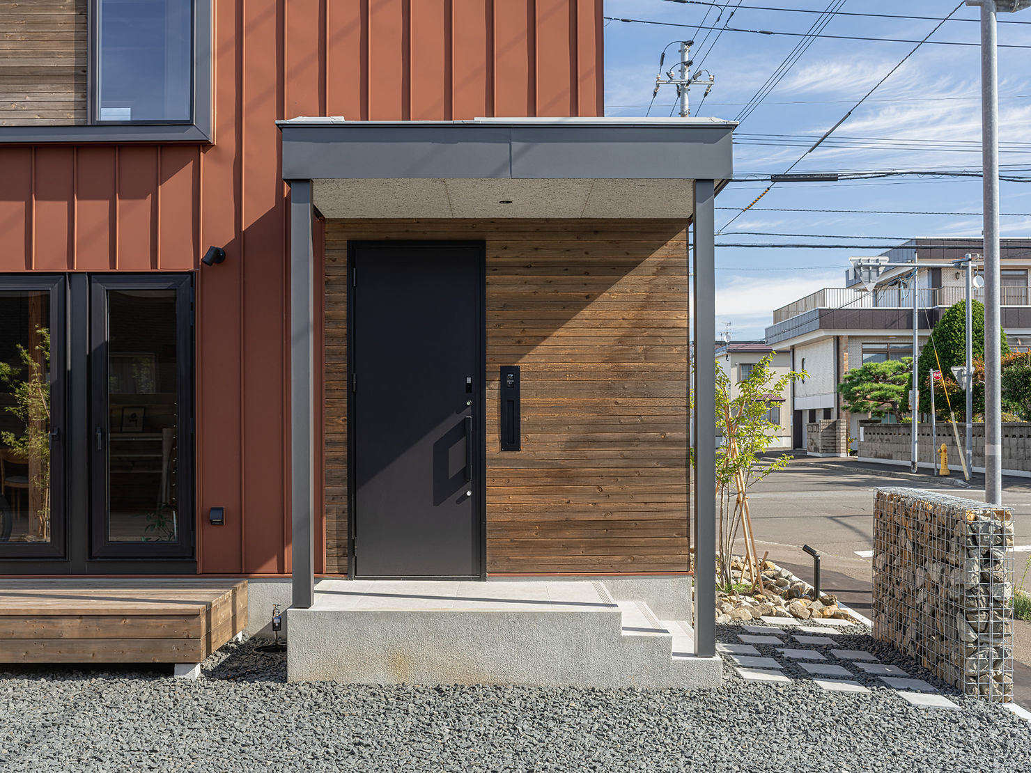 道路と距離の近い立地条件を踏まえ、玄関まわりには視線を遮る役割も兼ねたガビオンフェンスを設置。