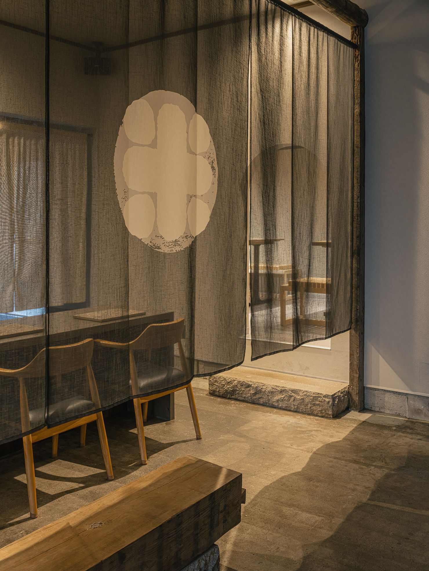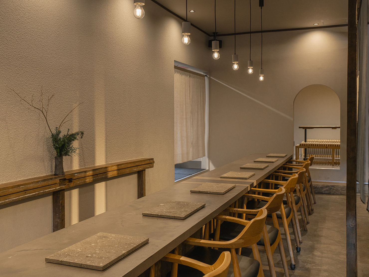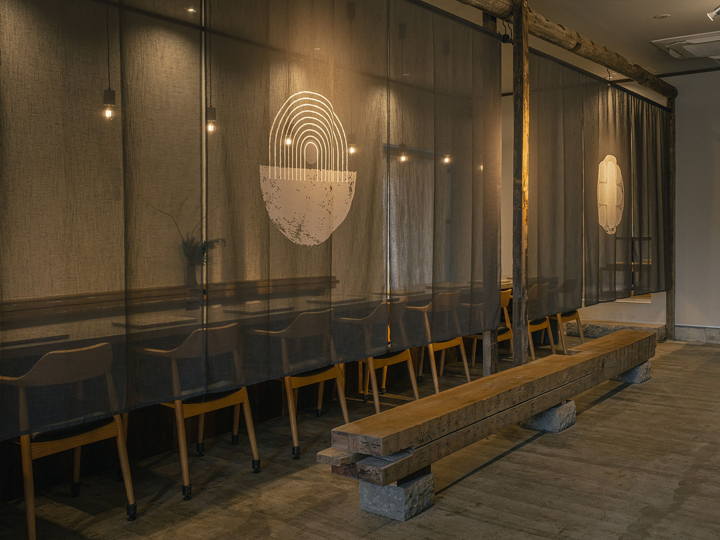メインカウンターと透け感のある暖簾が印象的な構成としながらも、既存建物の仕上げや構造との調和を大切にし、蘭越町の工場から仕入れた古材を採用。