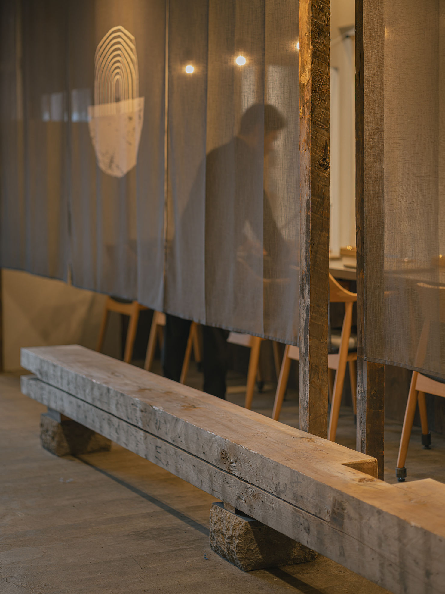 あえて加工を施さず継手や墨を残したまま暖簾まわりの梁や柱、待合ベンチに使用、その他さまざまな場所に古材を取り入れることで、空間全体に味わいのあるアクセントを与えています。
