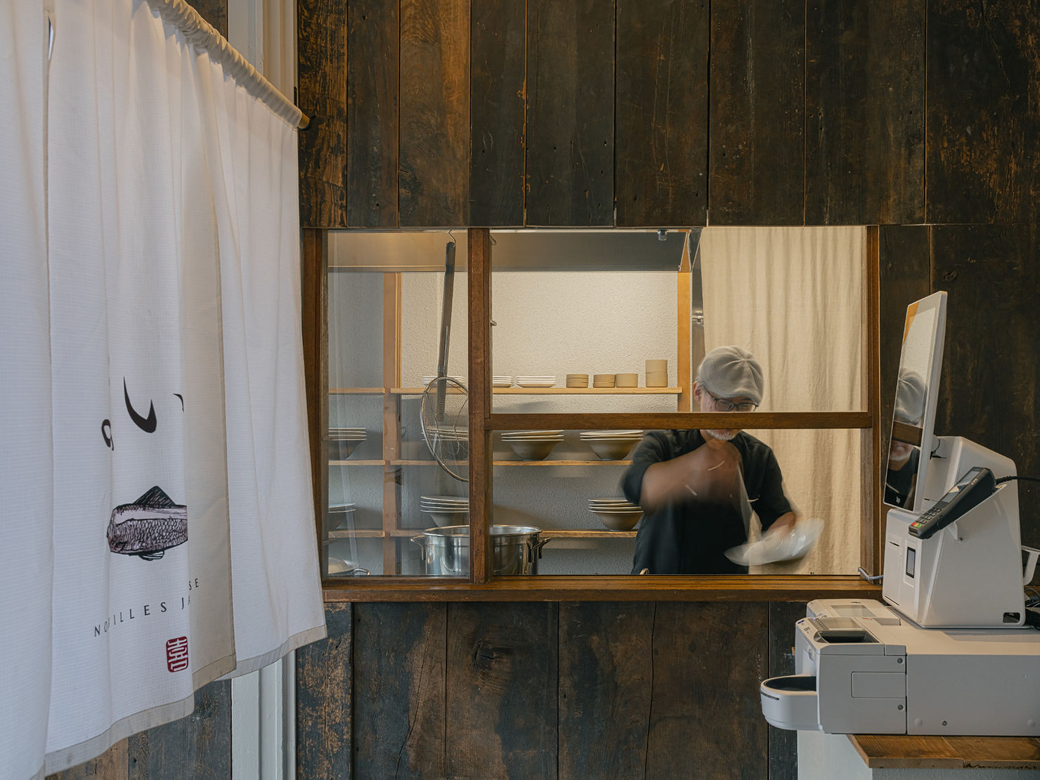また、入口すぐのスペースを活かし、麺を茹でる工程が見える調理場として計画。