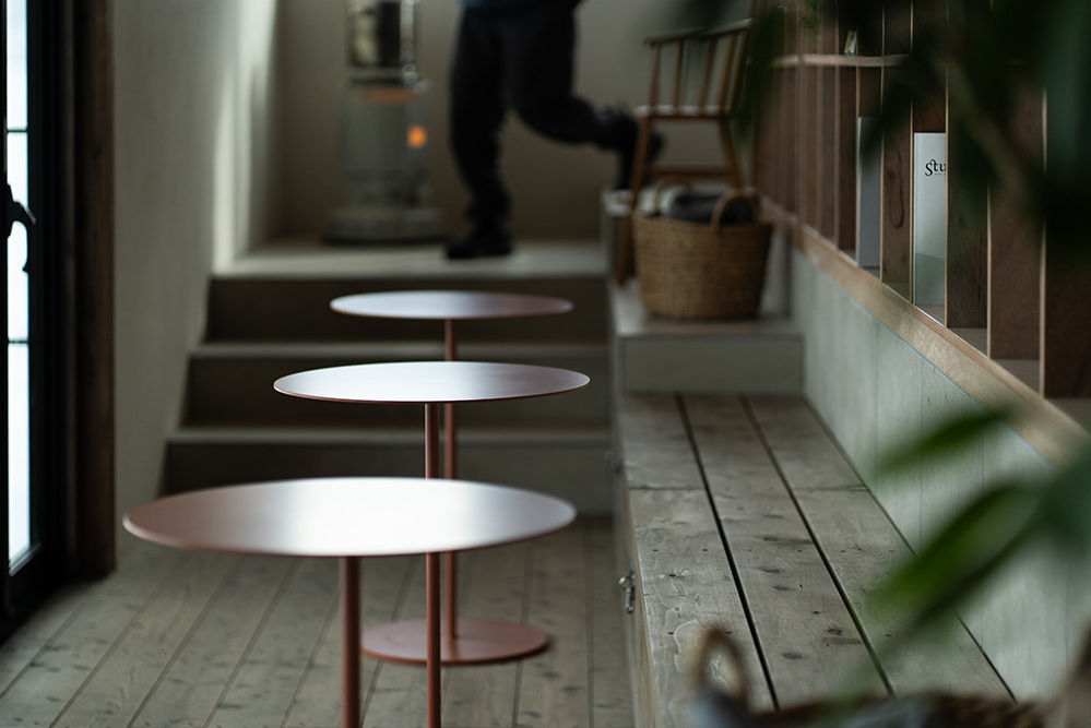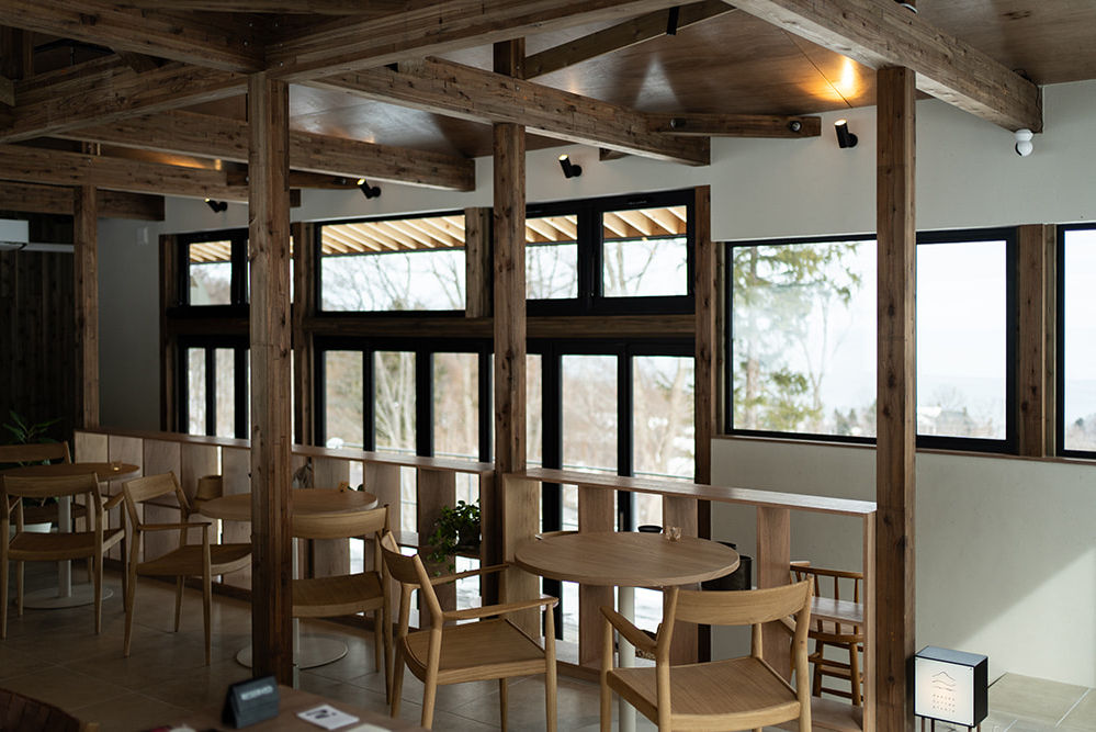 東屋の最大の魅力である石狩湾の眺望を活かすため、客席はすべて海側を向いた配置とし、動線を考慮してオリジナルサイズで造作したテーブルに、KARIMOKU CASEの椅子を組み合わせました。