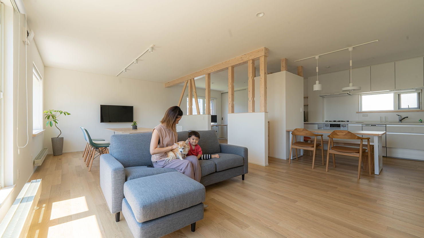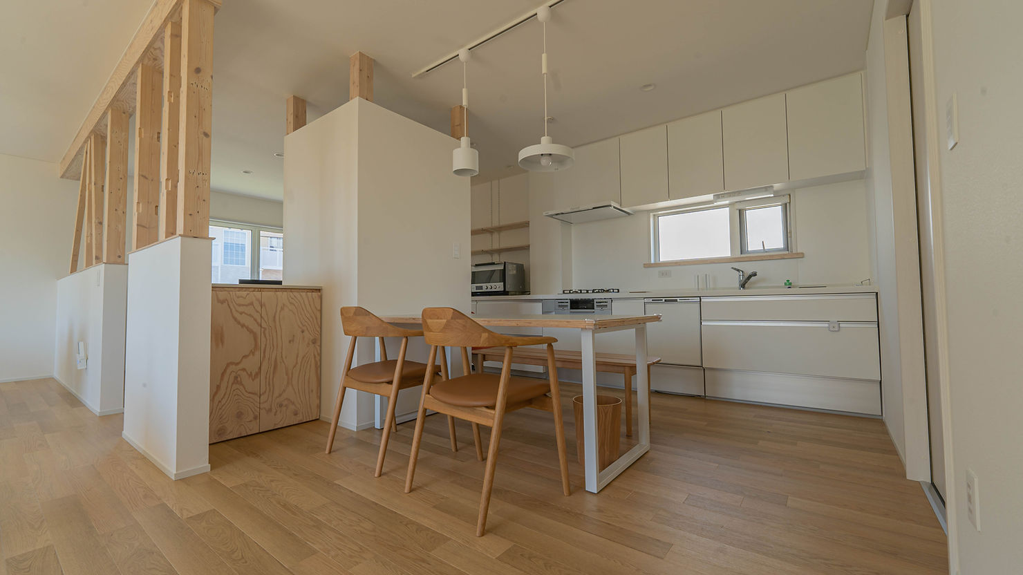 内装はナチュラルカラーの木、ホワイト・ライトグレーで統一し、外からの日差しと合わせ優しい明るさに。