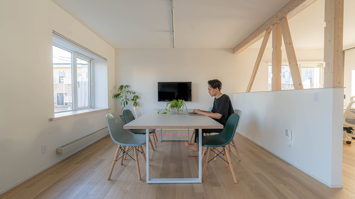 ミーティングスペース等、多目的に利用できるよう広々とした空間をつくるため、必要な構造柱以外は撤去し、目線を通せるように。