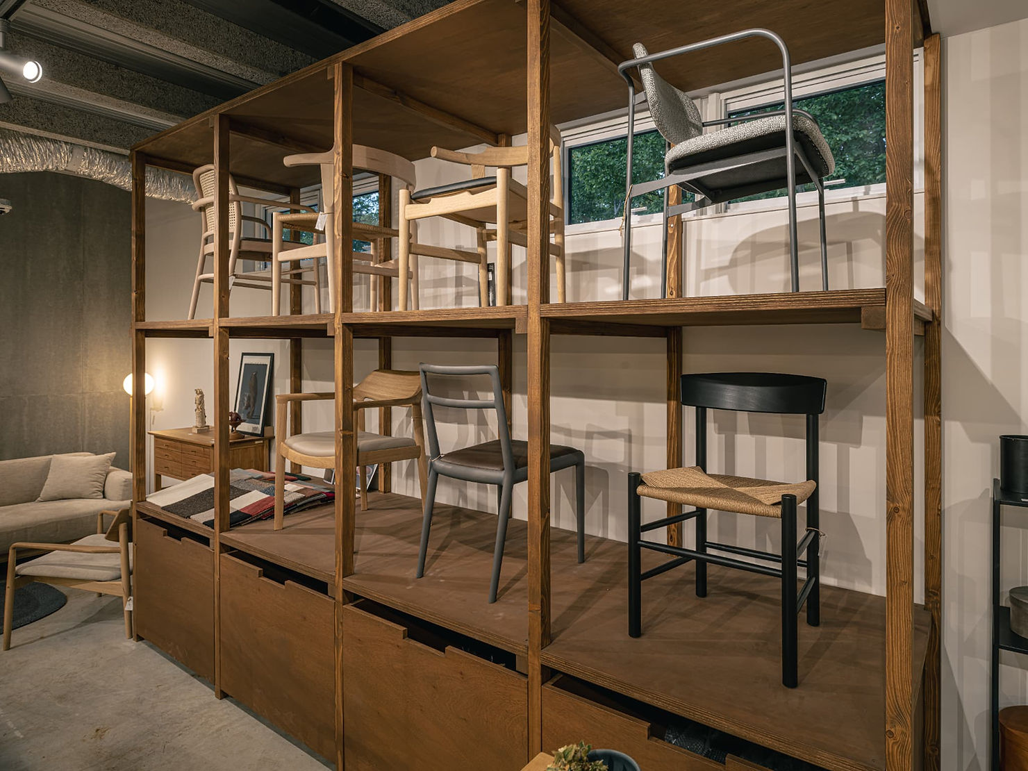 中でもメインとなる椅子の展示什器は、商品が見やすく、かつ美しく映える高さで造作。
